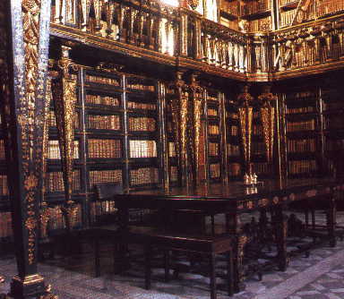 Fondée par le Roi D. Dinis en 1308 l’université de Coimbra est une des plus anciennes d’Europe, et jusqu’à 1911 la seule université du Portugal. Coimbra dont les maisons étagées s’étalent sur la colline de chaque côté du fleuve Mondego, est dominée par l’université. Installée dans l’ancien palais royal, l’esplanade de l’université offre un panorama sur les toits des vieux quartiers et la vallée du fleuve Mondego. La bibliothèque (ci-dessous) avec ses 300 000 volumes, ses plafonds peints en trompe l’oeil, la richesse de sa décoration où se mêlent or, marbre et bois exotiques, constitue un des sommets de l’art baroque.